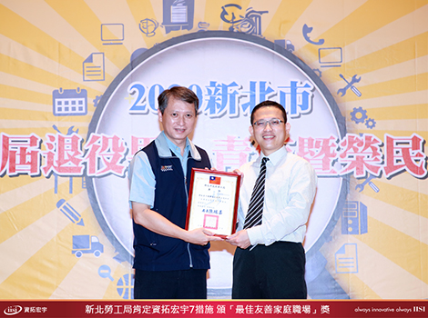 視人才為最重要資產的資拓宏宇公司,除了提供員工多元的在職訓練課程外,亦希望讓員工的家庭生活與工作取得良好的平衡,因此自民國102年開始,除了在原有已經優於法定特休天數之措施外,新增新生入學假、增加陪產假天數,逐年陸續增加產假天數、增加婚假天數、新增有薪家庭照顧假、全額負擔之團體保險費用擴及至員工配偶及子女,以及疫情期間提供全薪居家隔離檢疫假等7項措施,通過新北市政府勞工局審核,並於8月27日假新北市政府603大禮堂舉辦了公開表揚典禮,由勞工局局長陳瑞嘉親自頒發獎狀。