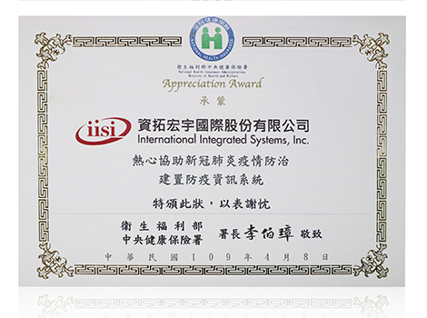 資拓宏宇因協助新冠肺炎疫情防治建置防疫資訊系統,獲衛福部健保署署長李伯璋頒發感謝狀。